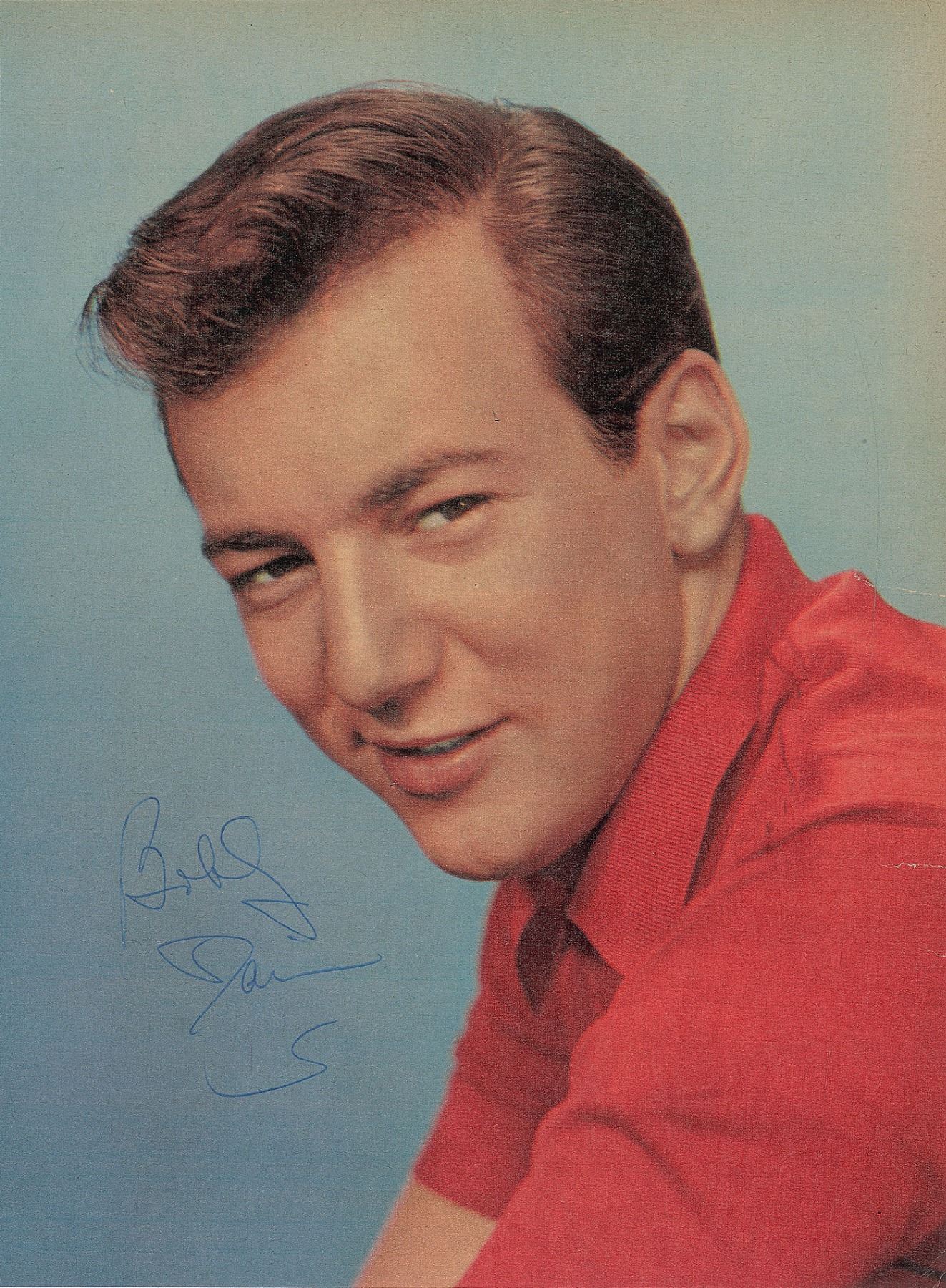 Two items: a handsome color 7.75 x 10.5 magazine photo of Darin in a bright red shirt, signed in blue ballpoint; and a You're the Reason I'm Living album, signed and inscribed on the front cover in black crayon. In overall fine condition, with some brushing to the signature on the album.