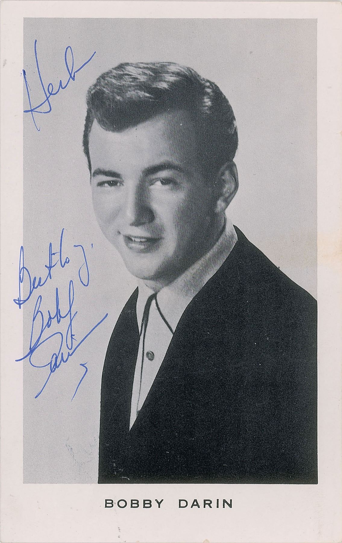 Glossy 3.5 x 5.5 cardstock photo of Darin in a head-and-shoulders pose, signed and inscribed in blue ballpoint, "Herb, Best to you, Bobby Darin.” In fine condition.