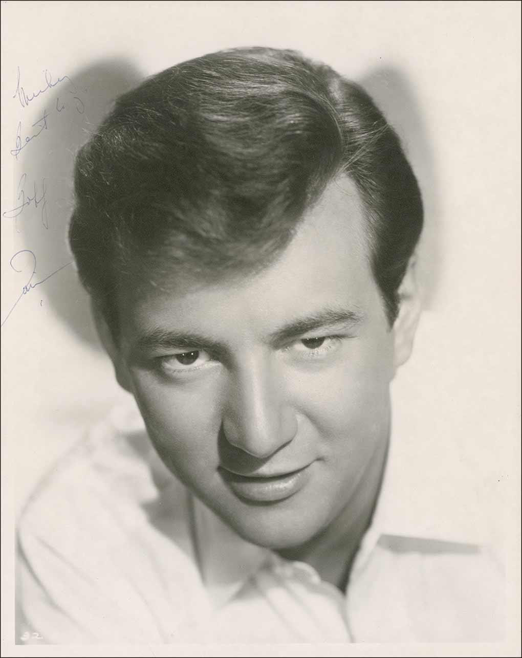 Versatile and popular American performer (1936–1973) who died at the age of 37 from complications following surgery for a faulty heart valve. Vintage matte-finish 8 x 10 head-and-shoulders photo, signed and inscribed in blue ballpoint “Mickey, Best to you, Bobby Darin.” In fine condition, with a few trivial corner tip dings.