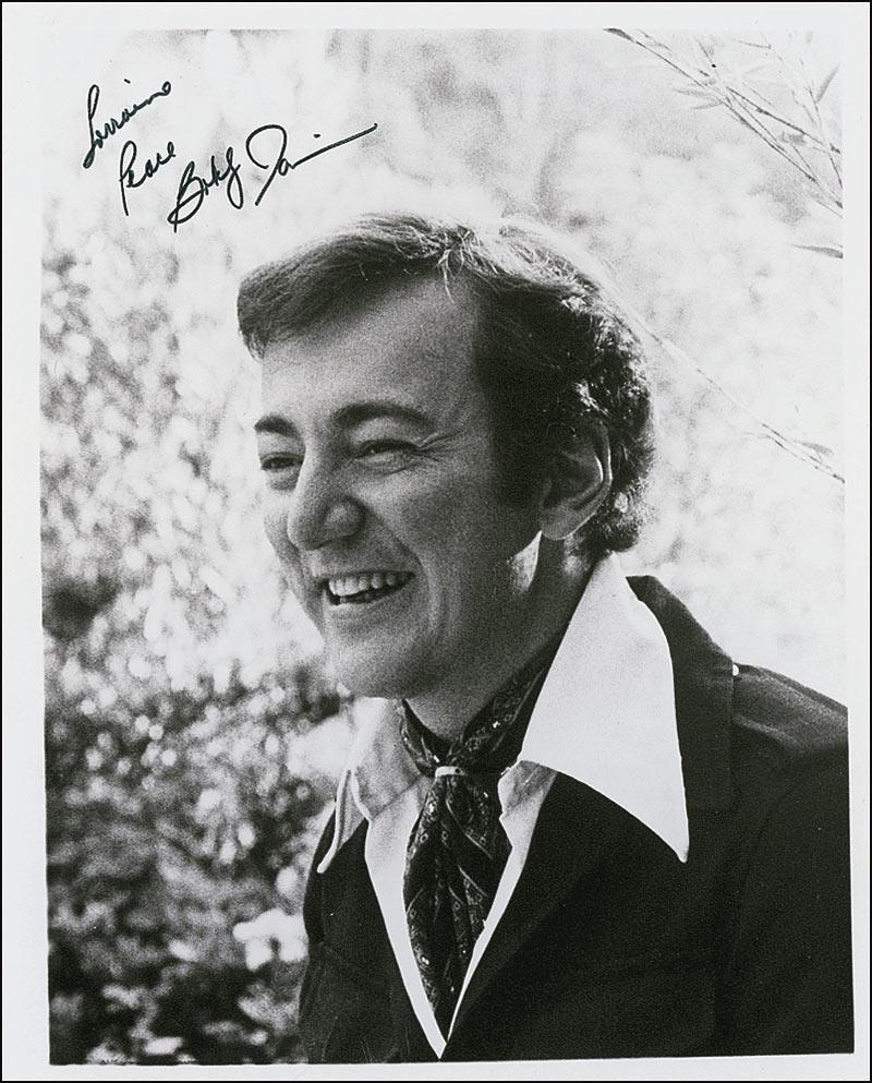 Versatile and popular American performer (1936–1973) who died at the age of 37 from complications following surgery for a faulty heart valve. Matte-finish 8 x 10 photo, signed and inscribed in black felt tip “Lorraine, Peace, Bobby Darin.” In very fine condition. Pre-certified Roger Epperson/REAL and RRAuction COA.