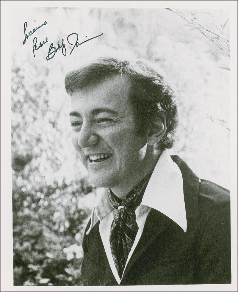 Versatile and popular American performer (1936–1973) who died at the age of 37 from complications following surgery for a faulty heart valve. Matte-finish 8 x 10 photo, signed and inscribed in black felt tip “Lorraine, Peace, Bobby Darin.” In very fine condition.