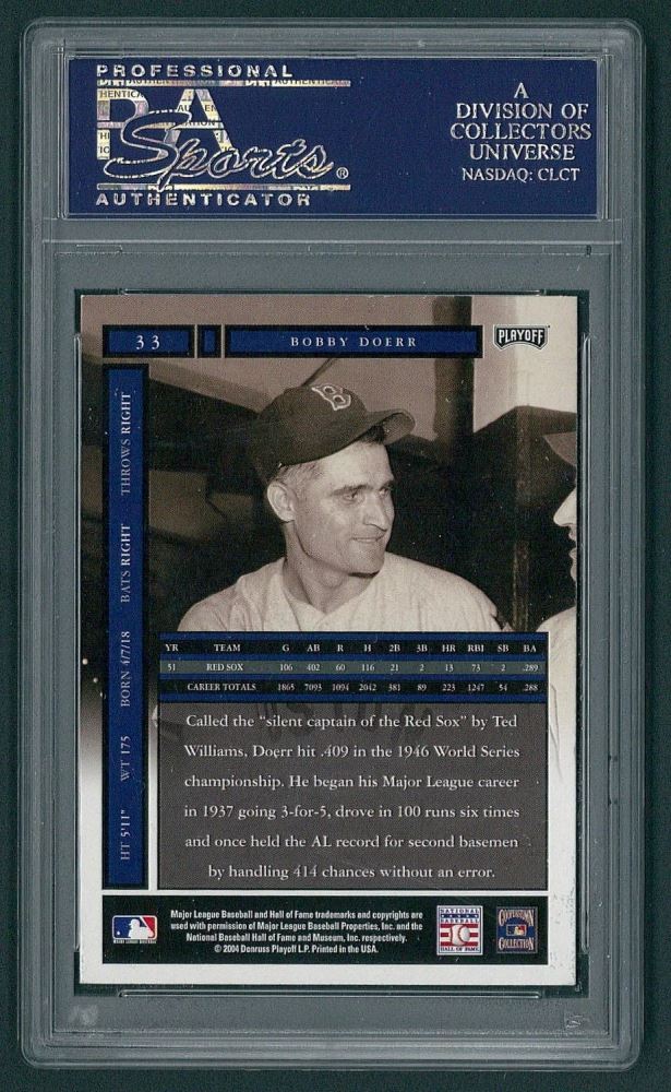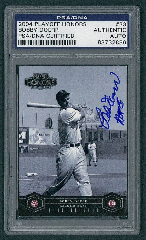 2004 Playoff Honors #33 Bobby Doerr Baseball Card. Hand-signed and inscribed in blue ink pen by Bobby Doerr (Red Sox HOF). Autograph has been certified and encapsulated by PSA/DNA for authenticity purposes.