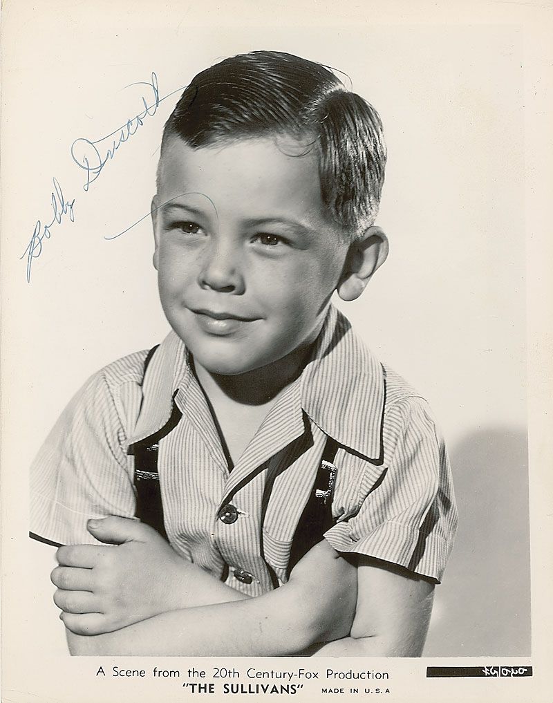American actor (1937–1968) best known for his childhood roles in such films as Song of the South and Treasure Island. In cruelly tragic Hollywood fashion, a precipitous decline in his career during his teenage and adult years led to drug addiction and his death from heart failure at the age of 31. Vintage glossy 8 x 10 Twentieth Century Fox promotional photo for The Sullivans, signed in fountain pen. In fine condition, with a few scattered light creases.