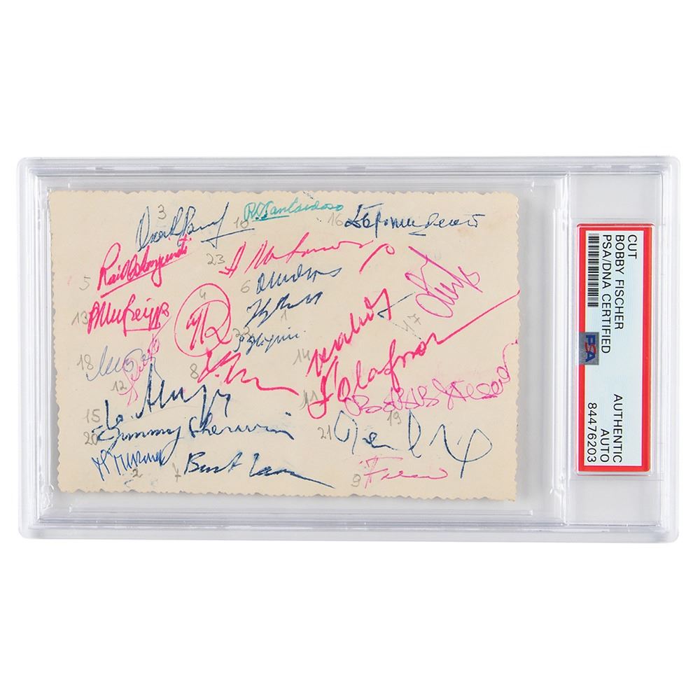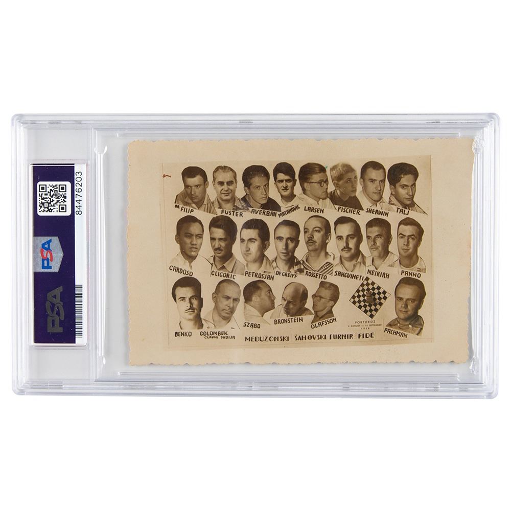 Vintage red ballpoint signature, "Bobby Fischer," on the reverse of a 5 x 3.25 postcard depicting the 21 competitors of the 1958 Portoroz Interzonal Chess Tournament, all of whom have joined Fischer in adding their autographs, including: Yuri Averbakh, Pal Benko, David Bronstein, Rodolfo Cardoso, Boris de Greiff, Miroslav Filip, Géza Füster, Svetozar Gligorić, Bent Larsen, Aleksandar Matanović, Oleg Neikirch, Friðrik Ólafsson, Ludek Pachman, Oscar Panno, Tigran Petrosian, Héctor Rossetto, Raúl Sanguineti, James Sherwin, László Szabó, and Mikhail Tal. The postcard is also signed by chess arbiters Harry Golombek and Vladimir Vuković. In fine condition. Encapsulated in a PSA/DNA authentication holder.