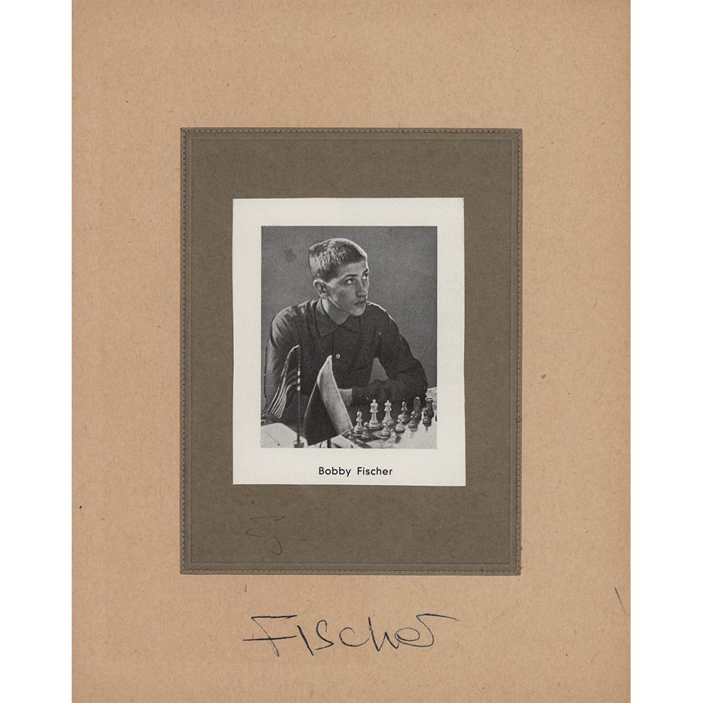 Four 2.5 x 3.25 photos cut from the program from the 150th Anniversary International Chess Tournament in Zurich, Switzerland, held from May 19–June 8, 1959, each affixed to a 6.25 x 8 cardstock mount, each signed on the mount in ink by the subject, including: Bobby Fischer, Paul Keres, Mikhail Tal, and Svetozar Gligoric. In overall fine condition.