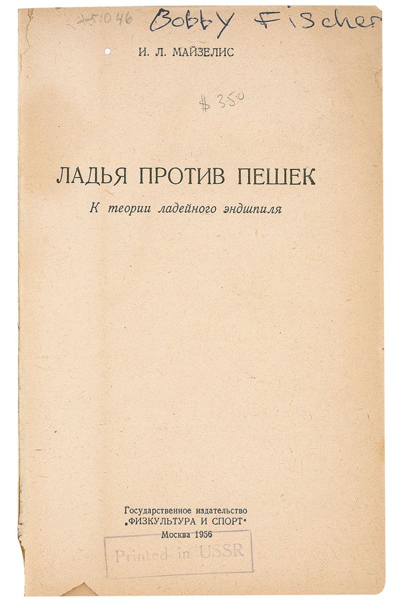 Reclusive American-born chess grandmaster (1943-2008) who scored a Cold War triumph by defeating Russian world champion Boris Spassky in a celebrated 1972 competition. A chess guide published in Moscow in 1956. Softcover, 5 x 7.75, 170 pages, with text in Russian, signed in blue ballpoint on the title page. Edge tears at the binding to the signed page and some cover soiling and wear, otherwise fine condition. A very tough autograph to find in any form.
