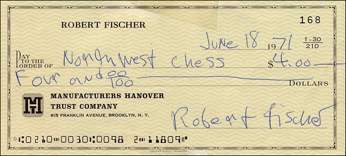 Scarce personal check, 6 x 2.75, filled out and signed by Fischer, payable to Northwest Chess for $4, June 18, 1971. In fine condition, with a central vertical fold and a small piece of tape affixed to top.
