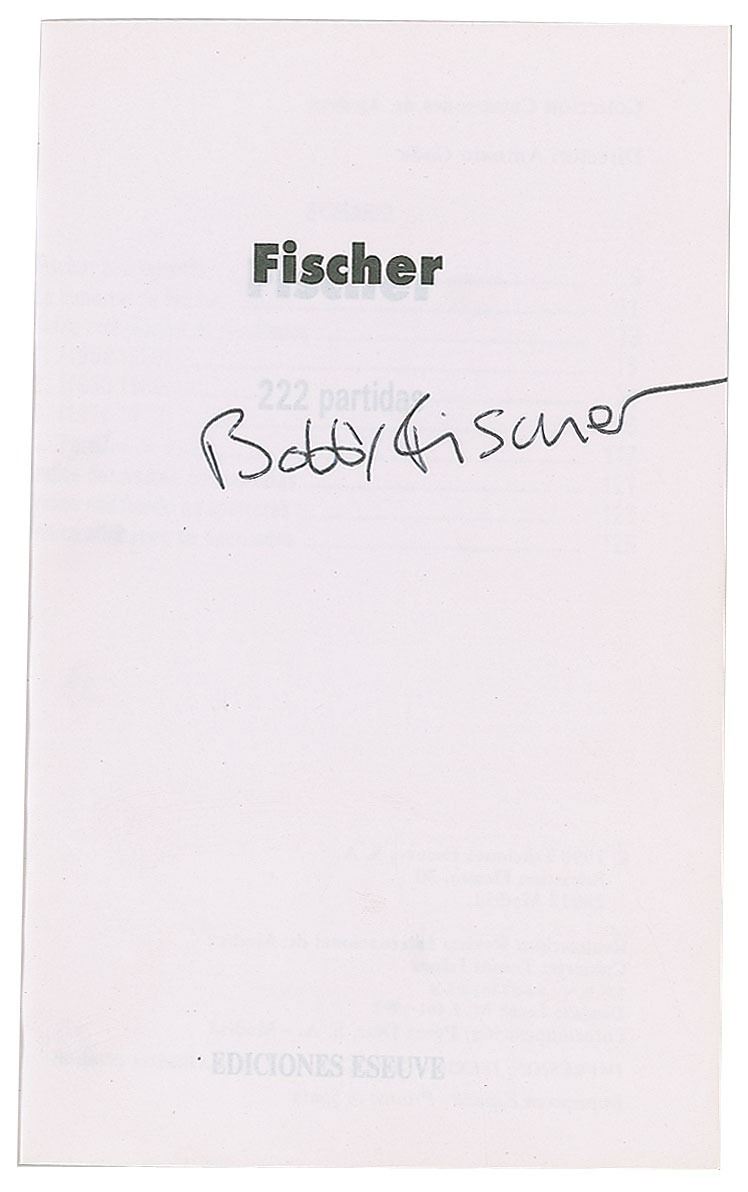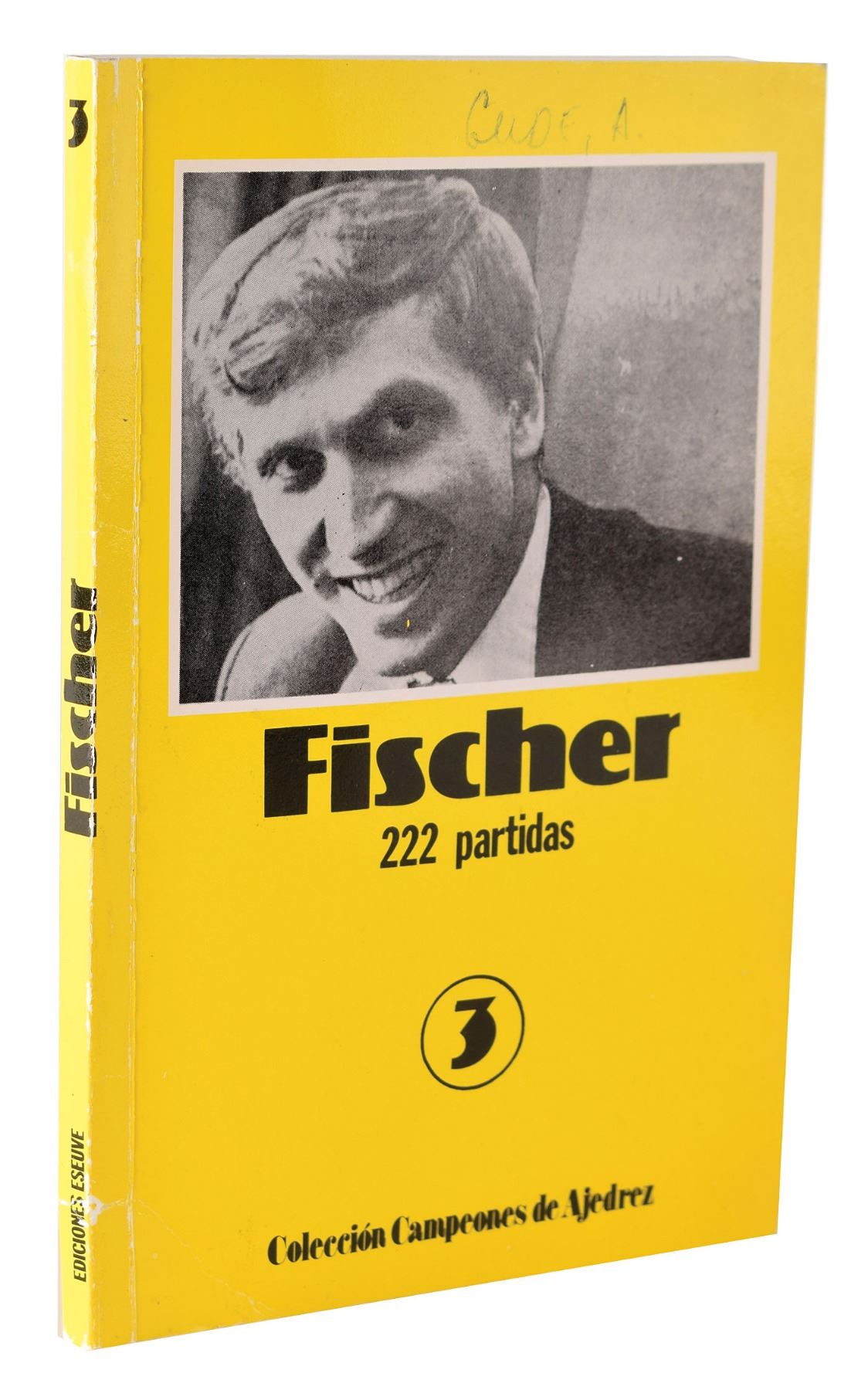 Signed book: Fischer: 222 Matches. Madrid, Spain: Ediciones Eseuve, 1990. Spanish-language paperback, 4.5 x 6.75, 126 pages. Signed on the half-title page in black ballpoint by Bobby Fischer. In very good to fine condition, with a corner crease, and ownership notation, to the front cover; inner pages are fine.