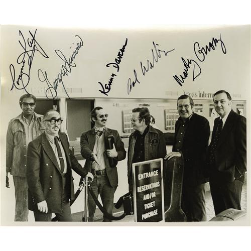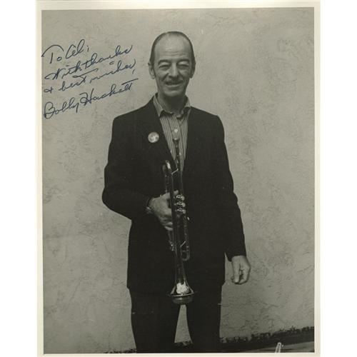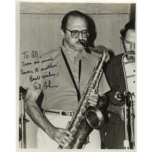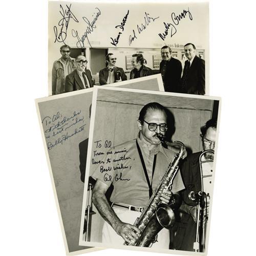 <B>Bobby Hackett, Al Cohn, Connie Kay, George Duvivier, Kenny Davern, Bob Wilber, and Marty Grosz, Autographed Al White "Jazz Party" Silver Prints, Group of 3 (1970-1978).</B></I> <BR>Al Cohn (tenor sax) and Jimmy Knepper (trombone, page 36) -- Al Cohn was a straight-ahead tenor sax man from the Big Band Era who was also a top arranger and composer. <BR>Connie Kay (drums), George Duvivier (bass), Kenny Davern (trumpet), Bob Wilber (clarinet), Marty Grosz (guitar), and Robert Nixon (Al White's friend, page 53) -- The Soprano Summit musicians are snapped at the Little Rock, Arkansas Airport in 1975. <BR>Bobby Hackett (trumpet, page 80) -- Bobby Hacket insisted on having his mouthpiece in his horn before Al White snapped this picture in 1970. <BR>Each 8" x 10" silver print is in Excellent condition. <I>From the Al White Jazz autograph archive.</B></I>