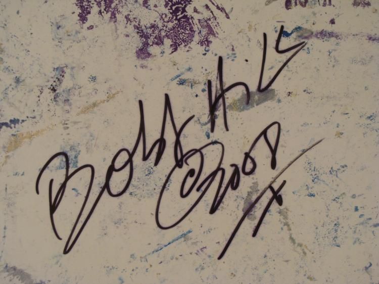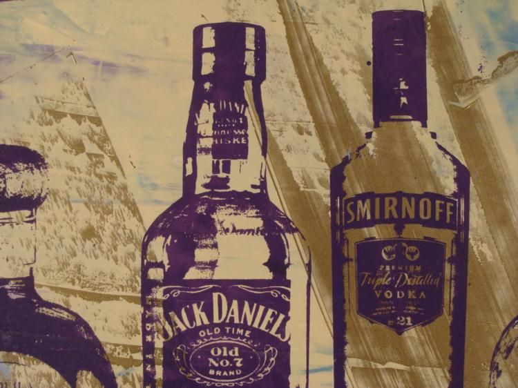 This is an original Pop Art painting of by noted urban artist Bobby Hill. Jim Beam, Jack Daniels, and other favorites are portrayed in this bottle collection, backed by blue and gold streaks of paint. Artist: Bobby Hill Title: Bottles GoldSignature: In