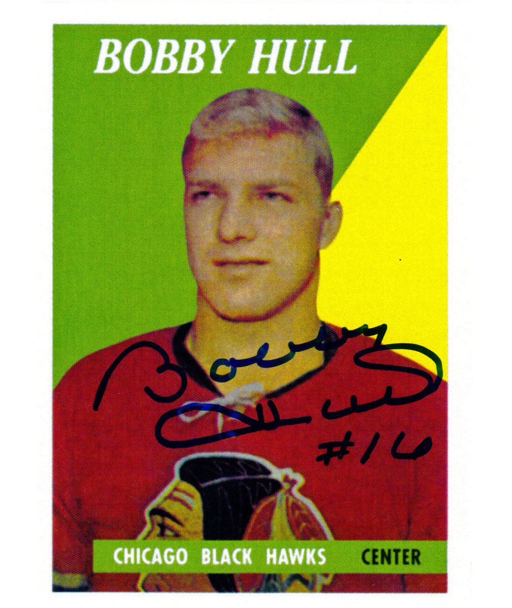 Bobby Hull signed 1958-59 Topps Blackhawks rookie re-print card #66 - this is a reproduction of his rookie card on cardstock, but the signature is authentic. Bobby Hull has added his rookie season number 16. Item comes with a Schwartz Sports Memorabilia