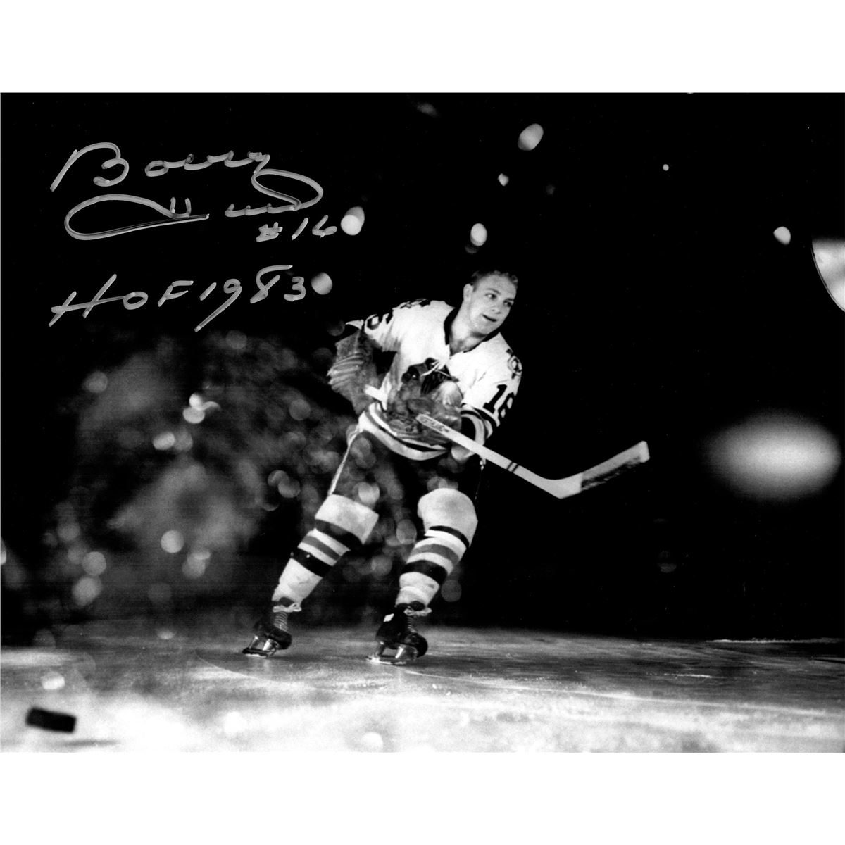 Bobby Hull signed Chicago Blackhawks black and white skating action 11x14 photo with 'HOF 1983' inscription. Item comes with a Schwartz Sports Memorabilia tamper-proof numbered hologram and Certificate of Authenticity which can be verified online.