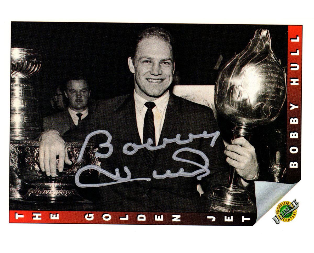 Bobby Hull signed Chicago Blackhawks 1992 Ultimate trading card #92. Item comes with a Schwartz Sports Memorabilia tamper-proof numbered hologram and Certificate of Authenticity which can be verified online.