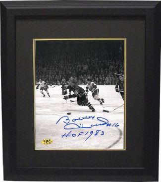 Bobby Hull is regarded as one of the greatest ice hockey players of all time and perhaps the greatest left winger to ever play the game. Hull was famous for his blonde hair, blinding skating speed, and having the fastest shot, earning him the nickname "the Golden Jet". He possessed the most feared slapshot of his day. In his 23 years in the National Hockey League and World Hockey Association, he played for the Chicago Black Hawks, Winnipeg Jets and Hartford Whalers. Hull was elected to the Hockey Hall of Fame in 1983. Bobby Hull has hand signed this famous Chicago Blackhawks B&W 8x10 Photo with HOF 1983 inscription. MAB Hologram and Certificate of Authenticity from Athlon Sports. Custom Black Mat and Premium Black Frame as shown.