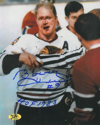 Bobby Hull is regarded as one of the greatest ice hockey players of all time and perhaps the greatest left winger to ever play the game. Hull was famous for his blonde hair, blinding skating speed, and having the fastest shot, earning him the nickname "the Golden Jet". He possessed the most feared slapshot of his day. In his 23 years in the National Hockey League and World Hockey Association, he played for the Chicago Black Hawks, Winnipeg Jets and Hartford Whalers. Hull was elected to the Hockey Hall of Fame in 1983. Bobby Hull has hand signed this famous Chicago Blackhawks Blood 8x10 Photo with HOF 1983 inscription. MAB Hologram and Certificate of Authenticity from Athlon Sports.