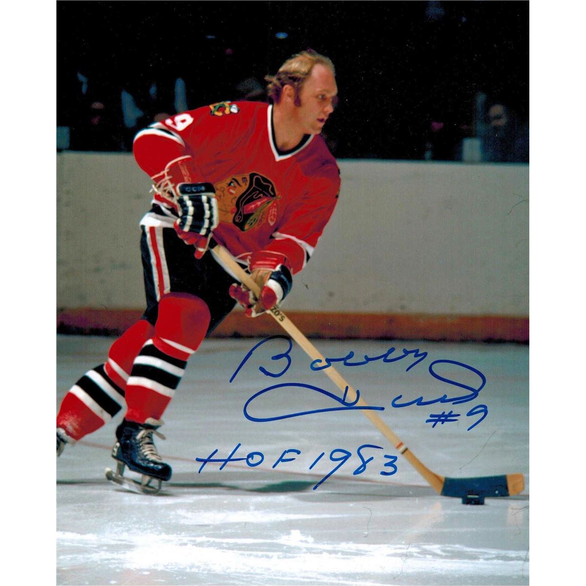 Bobby Hull signed Chicago Blackhawks action 8x10 photo with 'HOF 1983' inscription. Item comes with a Schwartz Sports Memorabilia tamper-proof numbered hologram and Certificate of Authenticity which can be verified online.