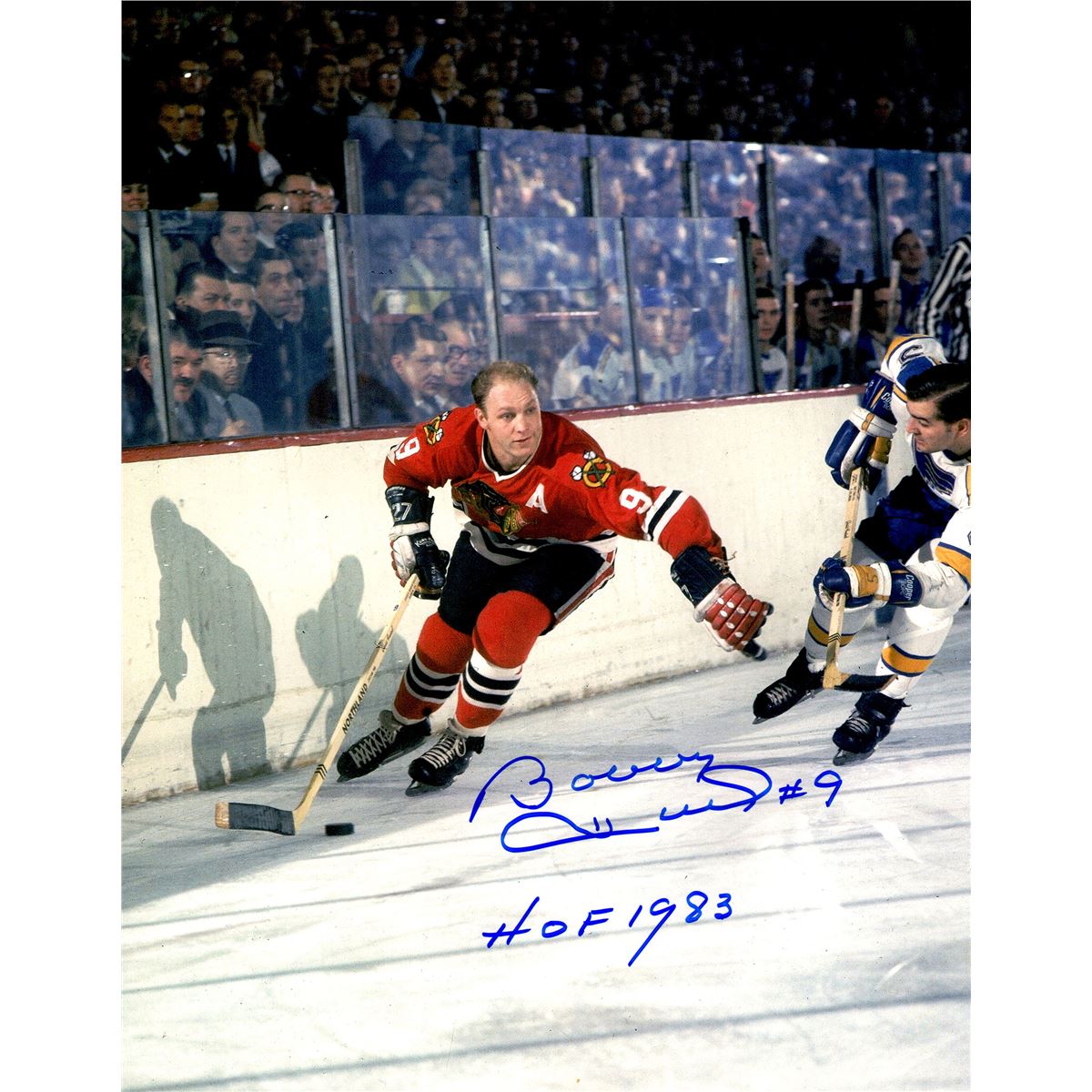 Bobby Hull signed Chicago Blackhawks action with puck 11x14 photo with 'HOF 1983' inscription. Item comes with a Schwartz Sports Memorabilia tamper-proof numbered hologram and Certificate of Authenticity which can be verified online.