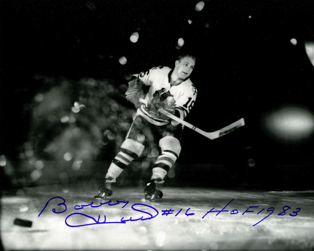 Bobby Hull signed Chicago Blackhawks black and white action 8x10 photo with 'HOF 1983' inscription. Item comes with a Schwartz Sports Memorabilia tamper-proof numbered hologram and Certificate of Authenticity which can be verified online.