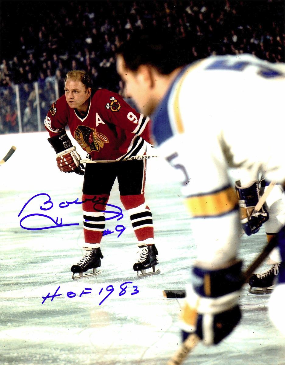 Bobby Hull signed Chicago Blackhawks in game color 11x14 photo with 'HOF 1983' inscription. Item comes with a Schwartz Sports Memorabilia tamper-proof numbered hologram and Certificate of Authenticity which can be verified online.