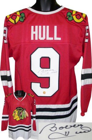 Bobby Hull is regarded as one of the greatest ice hockey players of all time and perhaps the greatest left winger to ever play the game. Hull was famous for his blonde hair, blinding skating speed, and having the fastest shot, earning him the nickname "the Golden Jet". He possessed the most feared slapshot of his day. In his 23 years in the National Hockey League and World Hockey Association, he played for the Chicago Black Hawks, Winnipeg Jets and Hartford Whalers. Hull was elected to the Hockey Hall of Fame in 1983. Bobby Hull has hand signed this Red Prostyle Chicago Blackhawks Jersey. Tri-Star Hologram and Certificate of Authenticity from Athlon Sports.