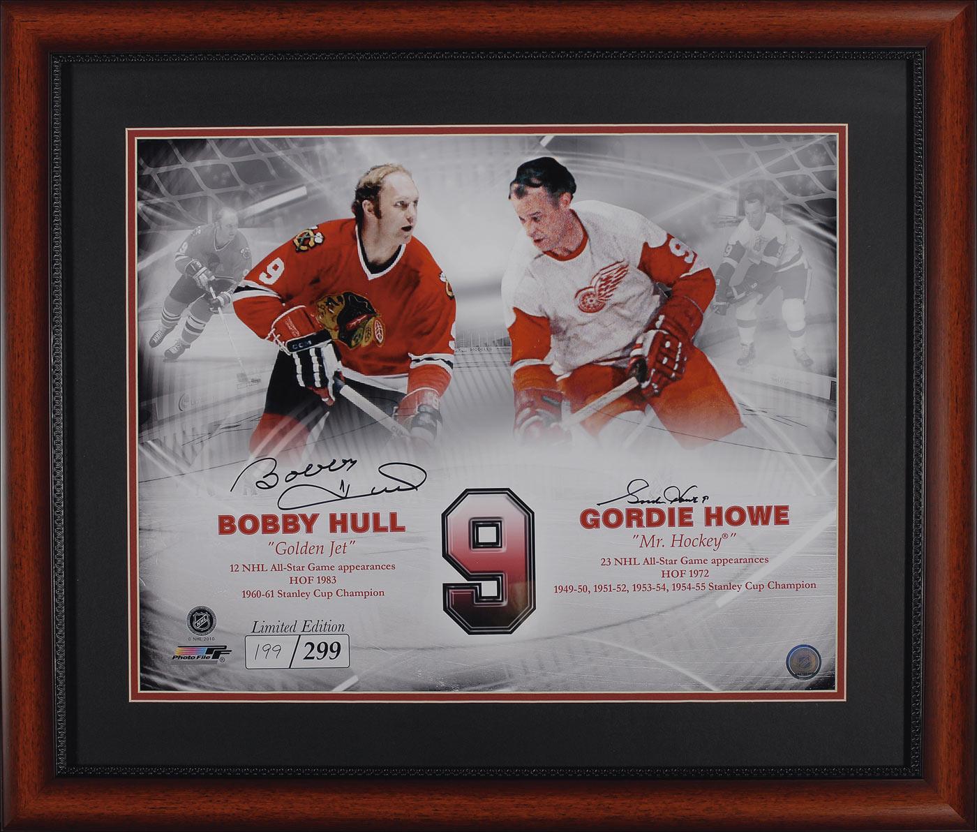 Limited edition color glossy 19 x 15.25 composite photo honoring the two hockey legends and their career achievements, #199/299, signed in black felt tip by both Hull and Howe. Double-matted and framed to an overall size of 27.25 x 23.25. In very fine condition.