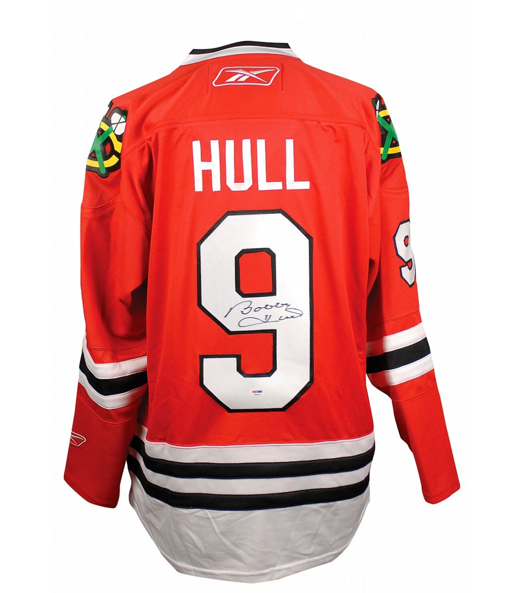 Official Reebok replica Chicago Black Hawks hockey jersey, with sewn on letters and numbers, signed in black felt tip on the number on the back. In fine condition, with slight spreading to the signature and a PSA/DNA label affixed to number. Accompanied by a certificate of authenticity from PSA/DNA.