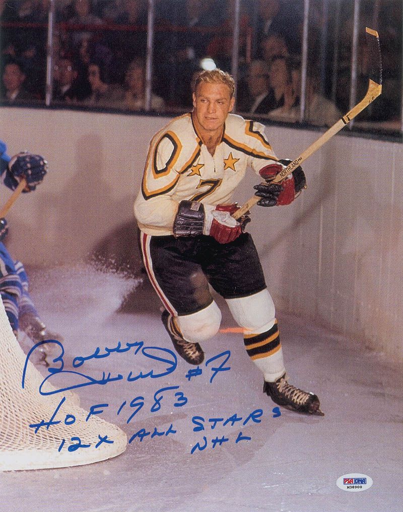 Color glossy 11 x 14 photo of Hull on the ice, signed in blue felt tip, “Bobby Hull #7, HOF 1983, 12x All Stars NHL.” In very fine condition, with a PSA/DNA label affixed to the lower right corner. Accompanied by a certificate of authenticity from PSA/DNA.