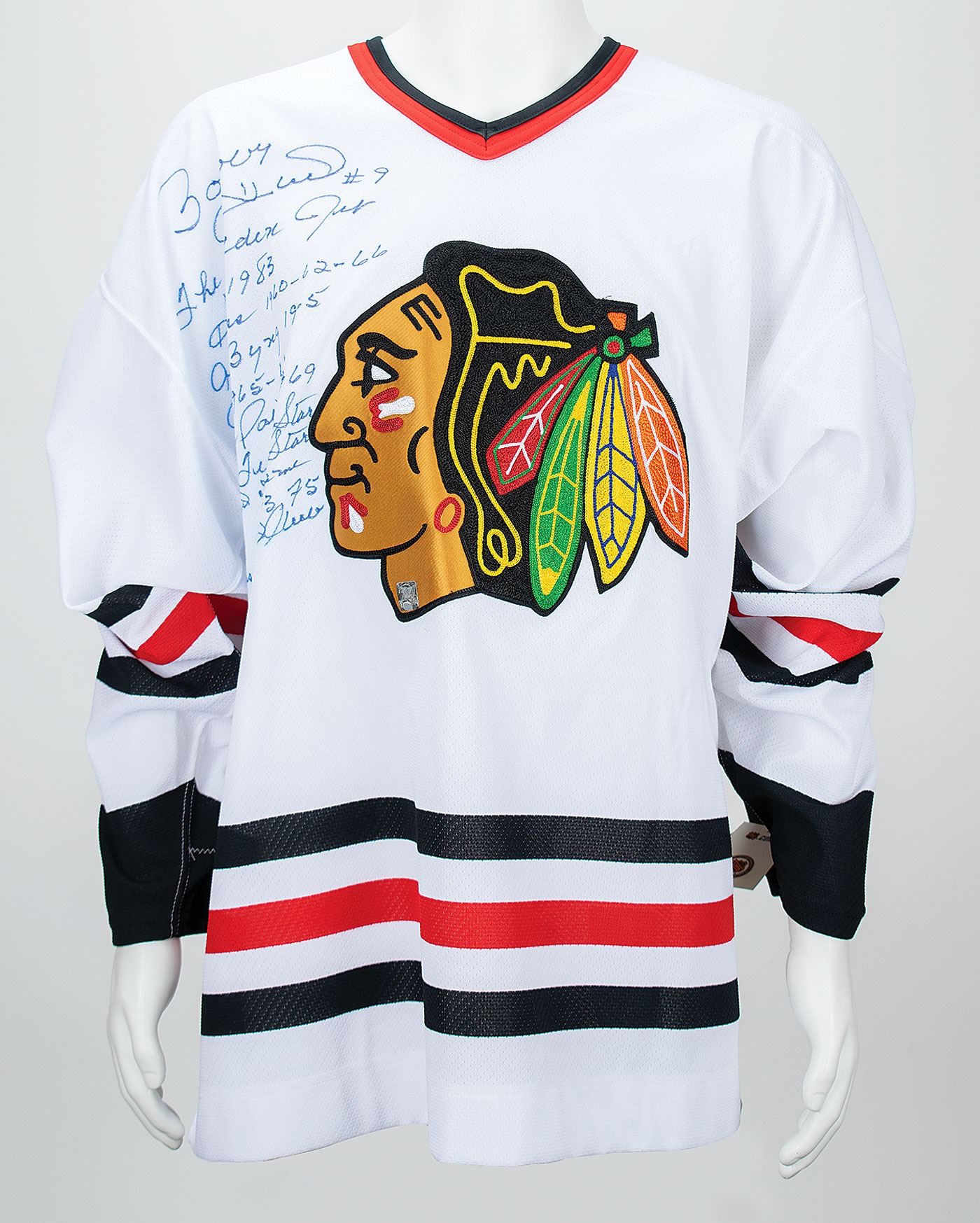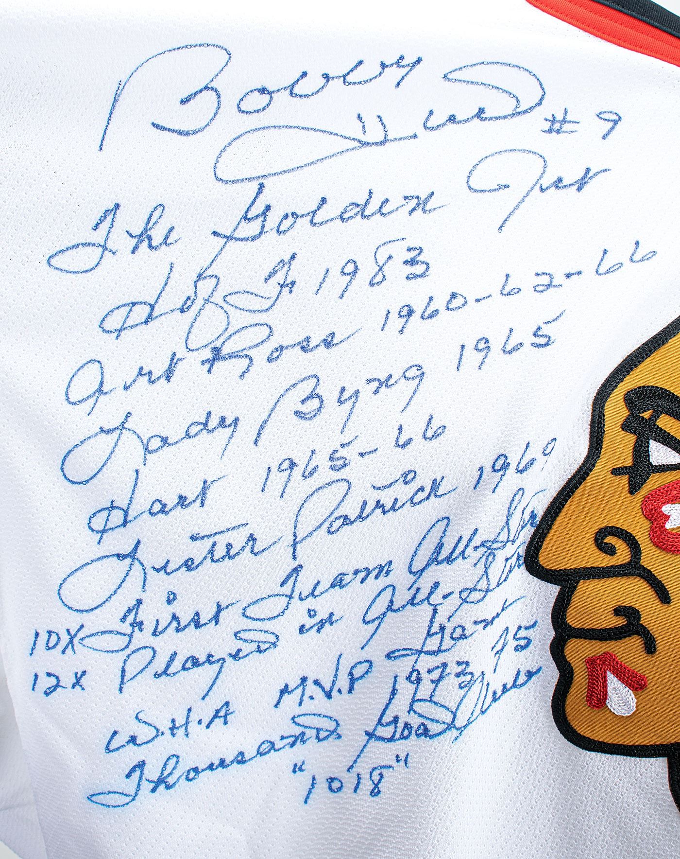 Official CCM Chicago Blackhawks authentic on-ice hockey jersey signed on the front in blue felt tip by Hull, who adds his accolades and achievements: "Bobby Hull #9, The Golden Jet, H of F 1983, Art Ross 1960-62-66, Lady Byng 1965, Hart 1965-66, Lester Patrick 1969, 10x First Team All Star, 12x Played in All Star Game, WHA MVP 1973 75, Thousand Goal Club '1018.'" In fine condition.