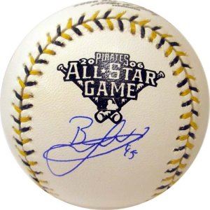 Bobby Jenks is a closer for the Chicago White Sox who made his MLB debut in 2005. Before injury setbacks, Jenks had one of the biggest arms in Major League Baseball, with a fastball that has hit 98 to 100 mph. According to the Baseball Almanac, his fastest pitch was clocked at 102 mph on August 27, 2005, at Safeco Field. He also has a slider, changeup, and a hard, sharp-breaking curveball. Jenks is currently third all-time in saves by a pitcher in a White Sox uniform. Bobby Jenks has hand autographed this 2006 All Star Official Major League Baseball. GTSM Hologram and Certificate of Authenticity.