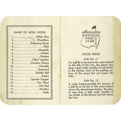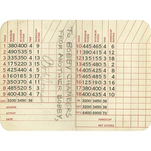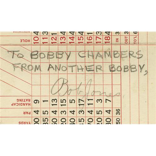 <B>1940's Bobby Jones Signed Augusta Scorecard.</B></I> “It seemed that this land had been lying here for years just waiting for somebody to lay a golf course on it,” Bobby Jones once said of the parcel of 365 acres in his hometown of Augusta, Georgia that would become a tangible part of his legacy. “Indeed, it looked as it were already a golf course.” Born from Jones’ desire to have a private course upon which to play, the Augusta National is today widely recognized as the sport’s finest, and serves as the home of the illustrious Masters tournament. One lucky linksman caught the Golden Age golf god enjoying a game there and came away from the meeting with this ultimate Jones autograph, penciled upon an unused scorecard from Augusta. A block lettered inscription preceding the 9+/10 autograph is likely in Jones’ hand, reading, "To Bobby Chambers from Another Bobby." The scorecard shows minor edge wear, but nothing to diminish the visual appeal. <I>LOA from PSA/DNA.</B></I>