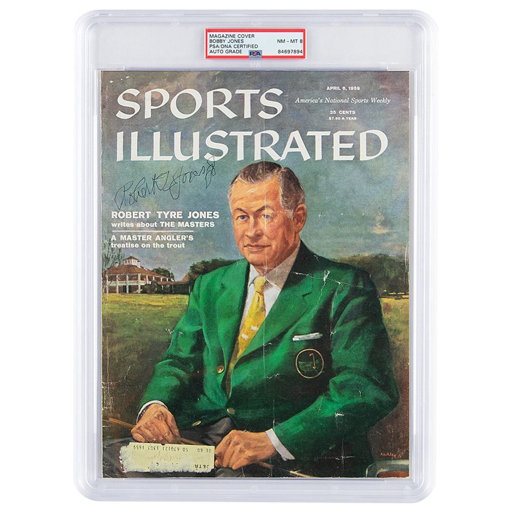 Cover from the Sports Illustrated magazine of April 6, 1959, featuring a story by Jones about The Masters, 8.25 x 11, signed in black ballpoint, "Robert T. Jones, Jr." In very good to fine condition, with creasing and mailing folds. Encapsulated and graded by PSA/DNA as "NM-MT 8."