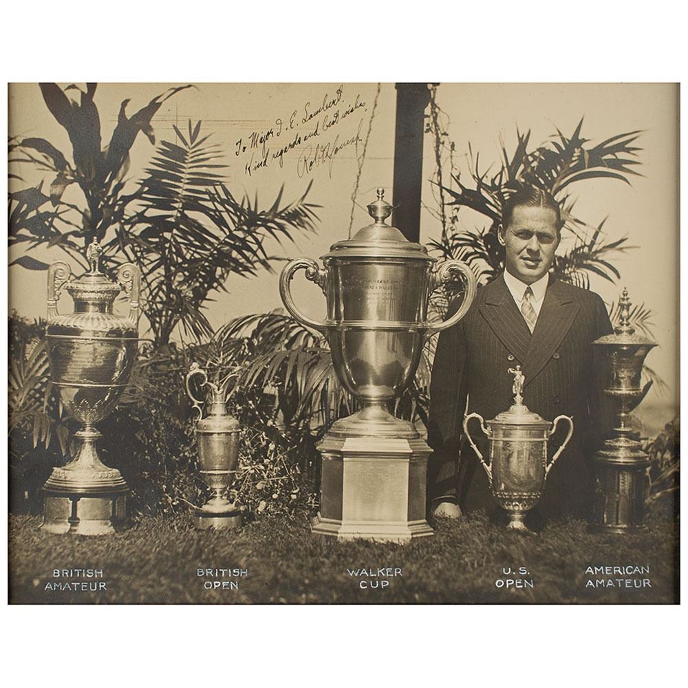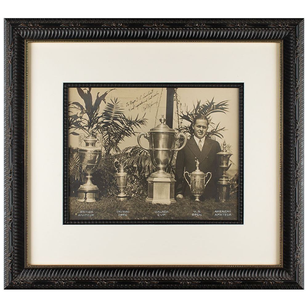 Tremendous vintage oversized matte-finish 13.25 x 10.25 photo of the great Bobby Jones, at the pinnacle of his golfing powers in 1930, wearing a dapper suit and posing with his victory cups of the British Amateur, the British Open, the U.S. Open, the American Amateur, and, at center, the Walker Cup, a biennial contest pitting the best American amateurs against those of the British Isles. Signed and inscribed in beautiful bold fountain pen to celebrity attorney J. E. ‘Ike’ Lambert, “To Major J. E. Lambert, Kind regards and best wishes, Robt. T. Jones, Jr.†Tastefully matted and framed to an overall size of 23.25 x 21. In fine condition.