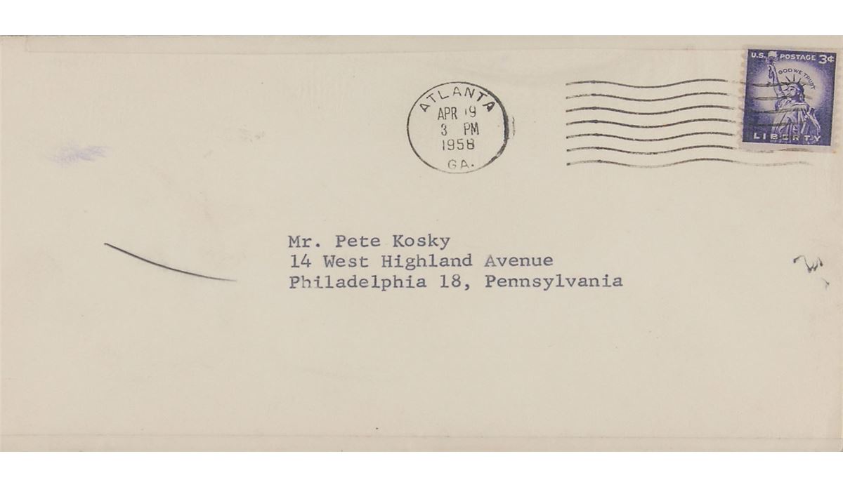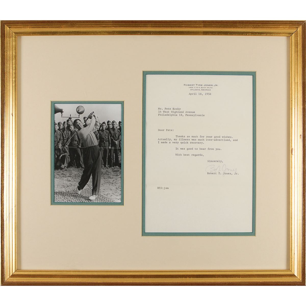 TLS signed “Bob Jones,” one page, 6.75 x 9.75, personal letterhead, April 18, 1958. Letter to fellow golfer Pete Kosky, in part: “Actually my illness was much over-advertised, and I made a very quick recovery.” Double-matted and framed with a photo of Jones admiring his shot to an overall size of 19 x 16.5. In fine condition. In 1948 Jones was diagnosed with the rare central nervous system disease syringomyelia, a debilitating disorder in which a cyst forms within the spinal cord. Five months after this letter was written the people of St. Andrew's, Scotland, awarded Jones the Freedom of the City and the Royal Burgh of St. Andrew's awards in what has been called the most moving ceremony in the history of golf.