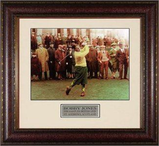 Robert Tyre "Bobby" Jones Jr. is most famous for his unique "Grand Slam," consisting of his victory in all four major golf tournaments of his era (the open and amateur championships in both the U.S. & Britain) in a single calendar year (1930). Jones founded and helped design the Augusta National Golf Club, and co-founded the Masters Tournament. In all Jones played in 31 majors, winning 13 and placing among the top ten finishers 27 times. This is a Bobby Jones unautographed 11x14 photo from the 1930 British Open. Custom Leather Framed and Matted.