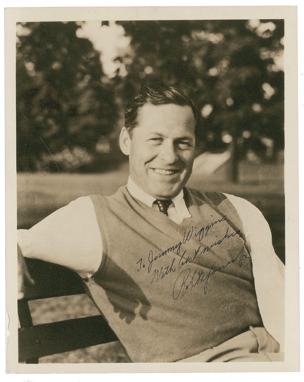 Golfer (1902–1971) who, in 1930, became the only Grand Slam winner in the sport’s history, taking the US and British Open and US and British Amateur titles. He was posthumously elected to the World Golf Hall of Fame in 1974. Vintage matte-finish 8 x 10 photo, signed and inscribed in fountain pen “To Jimmy Wiggins, With best wishes, Robt. Jones, Jr.” In fine condition, with a few creases at the extreme lower left edge. A desirable image from around the peak of his career.