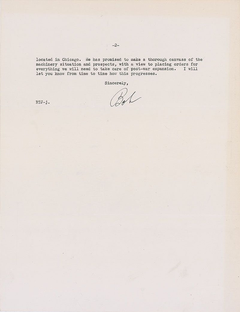 Partial TLS signed “Bob,” one page, 8.25 x 11, no date. Second page of a two-page letter from Jones. In part: “He has promised to make a thorough canvass of the machinery situation and prospects, with a view to placing orders for everything we will need to take care of post-war expansion.” In fine condition, with mild toning to two edges and a James Spence authentication label affixed to lower corner of reverse. Accompanied by a letter of authenticity from James Spence.