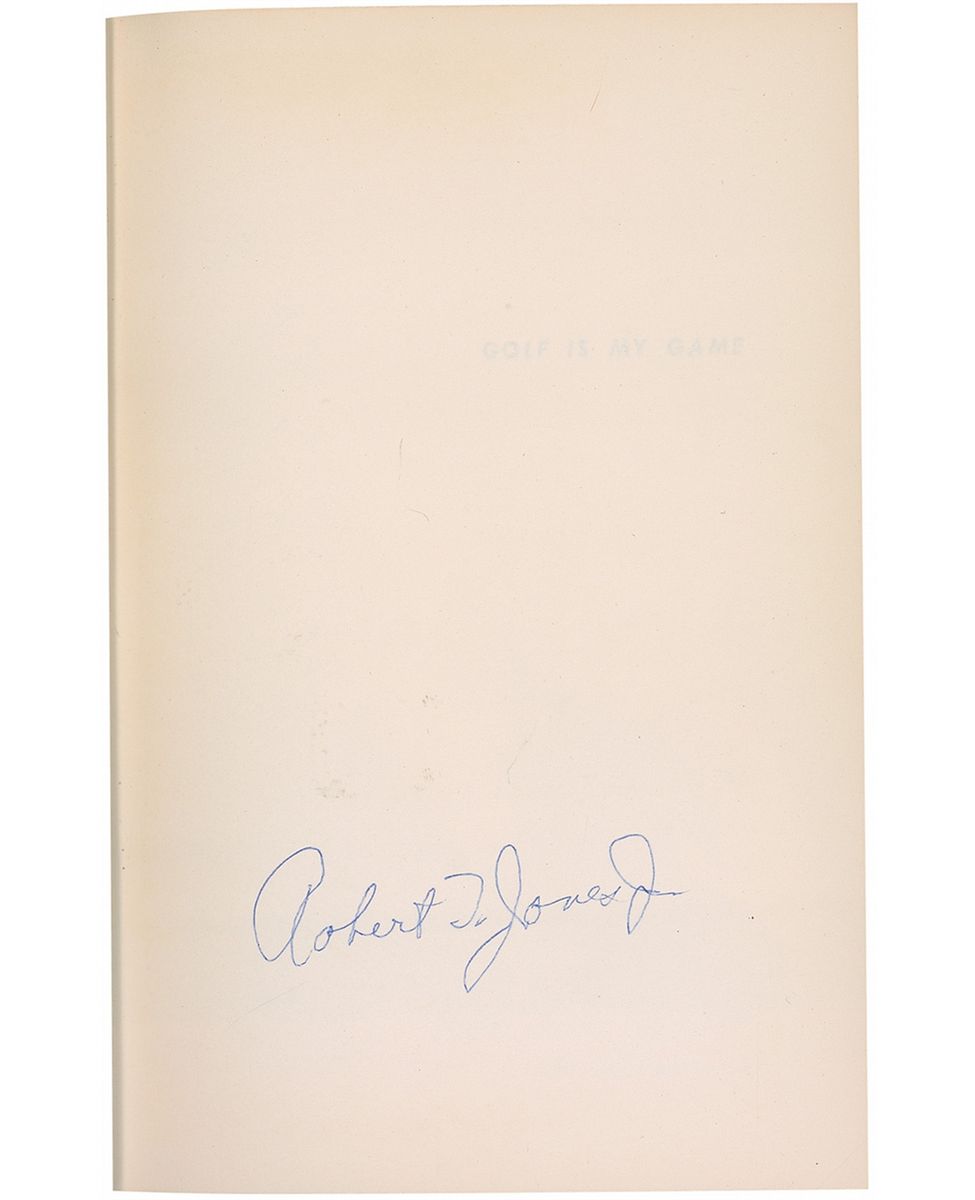 Signed book: Golf Is My Game. First edition. NY: Doubleday, 1960. Hardcover with dustjacket, 6.25 x 9.5, 255 pages. Signed on the second free end page in blue ballpoint, “Robert T. Jones, Jr.” Book description: VG+/VG+. Green paper-covered boards and black cloth-covered spine; minor rubbing to edges, mostly at corners/spine-ends; minor yellowing to textblock edges and feps. Dust jacket in protective mylar cover; small chips/tears and creases along edges; slightly yellowed and soiled; spine slightly sunned.