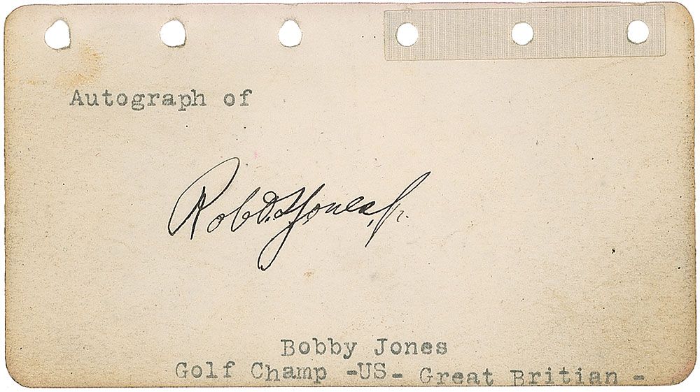 Vintage middle-age ink signature, “Robt. T. Jones, J,” on an off-white 4.5 x 2.5 page. In fine condition, with some mild edge toning and reinforcement to holes along top edge.