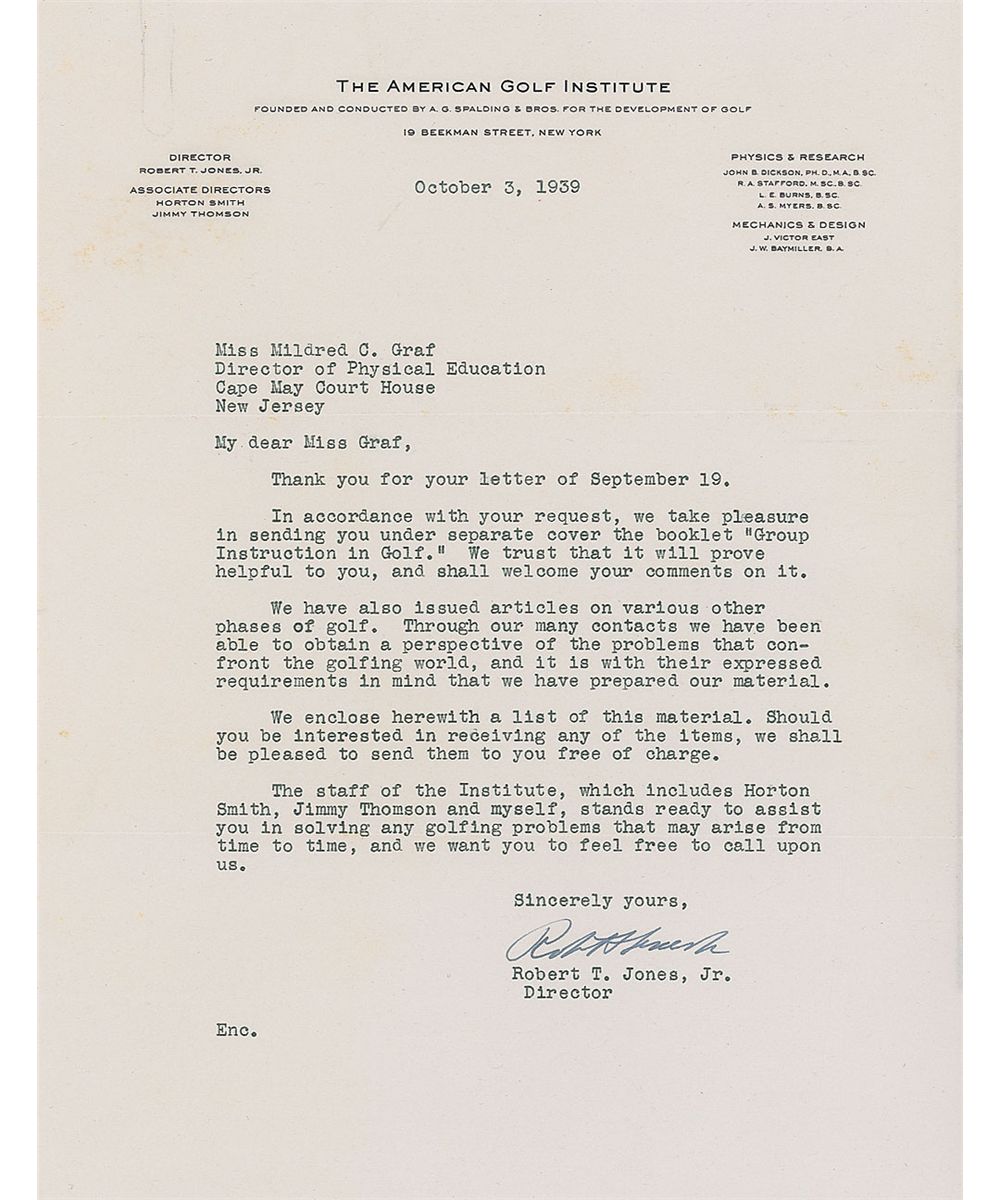TLS signed “Robt T. Jones, Jr,” one page, 8.5 x 11, The American Golf Institute letterhead, October 3, 1939. Letter to a physical education instructor. In part: “In accordance with your request, we take pleasure in sending you under separate cover the booklet ‘Group Instruction in Golf.’ We trust that it will prove helpful to you, and shall welcome your comments on it…Through our many contacts we have been able to obtain a perspective of the problems that confront the golfing world, and it is with their expressed requirements in mind that we have prepared our material…The staff of the Institute, which includes Horton Smith, Jimmy Thomson and myself, stands ready to assist you in solving any golfing problems that may arise from time to time, and we want you to feel free to call upon us.” In fine condition, with a paperclip impression to top edge. Accompanied by the original mailing envelope.