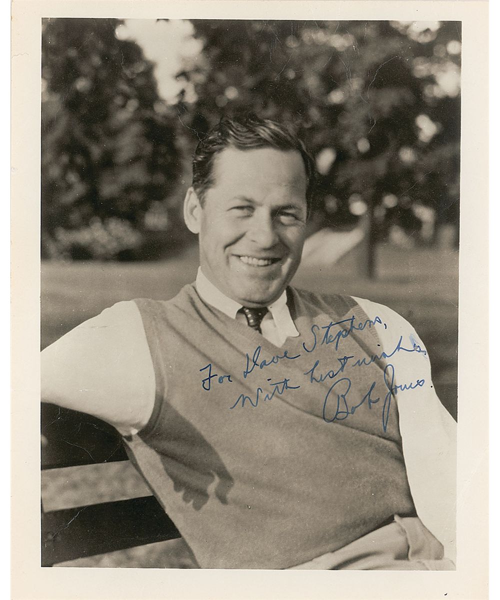 Vintage 8 x 10 photo of Jones relaxing on a bench out on the golf course, signed and inscribed in fountain pen, “For Dave Stephens, with best wishes, Bob Jones.” In very good condition, with moderate creasing to top half and edges of photo (affecting overall appearance but not signature), and a small brush to end of inscription.