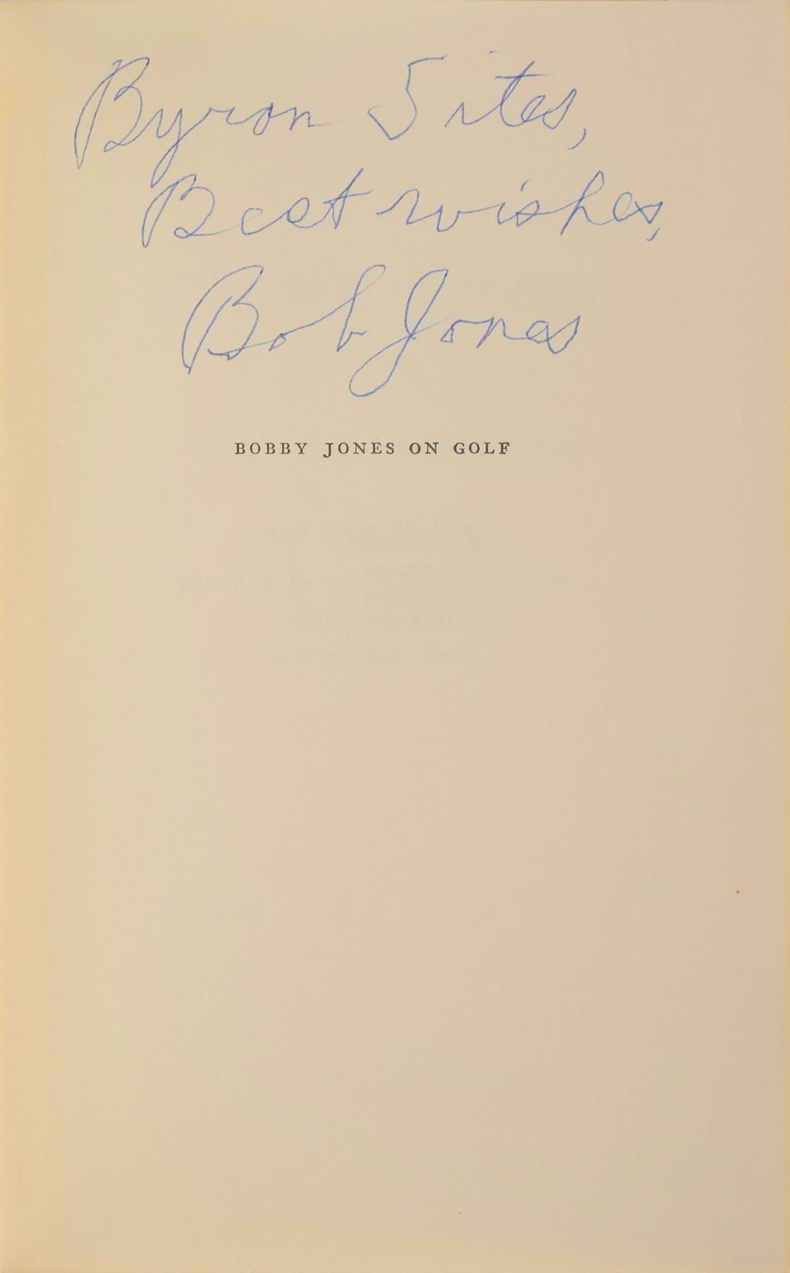Signed book: Bobby Jones on Golf. First edition. NY: Doubleday & Company, 1966. Hardcover with dust jacket, 6.5 x 9.5, 246 pages. Signed and inscribed on the half-title page in blue ballpoint, "Byron Sites, Best wishes, Bob Jones." In fine condition, with some wear to dust jacket edges.