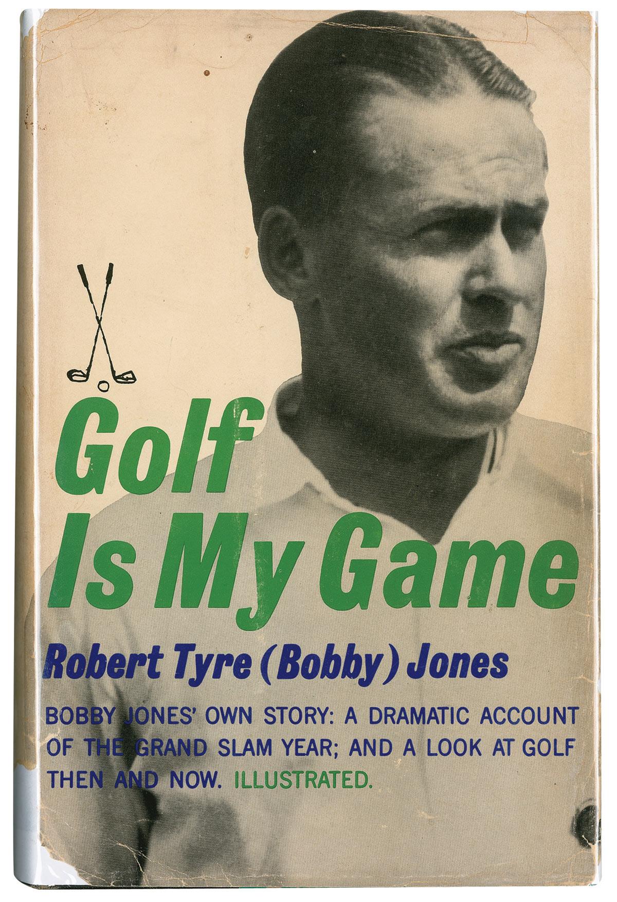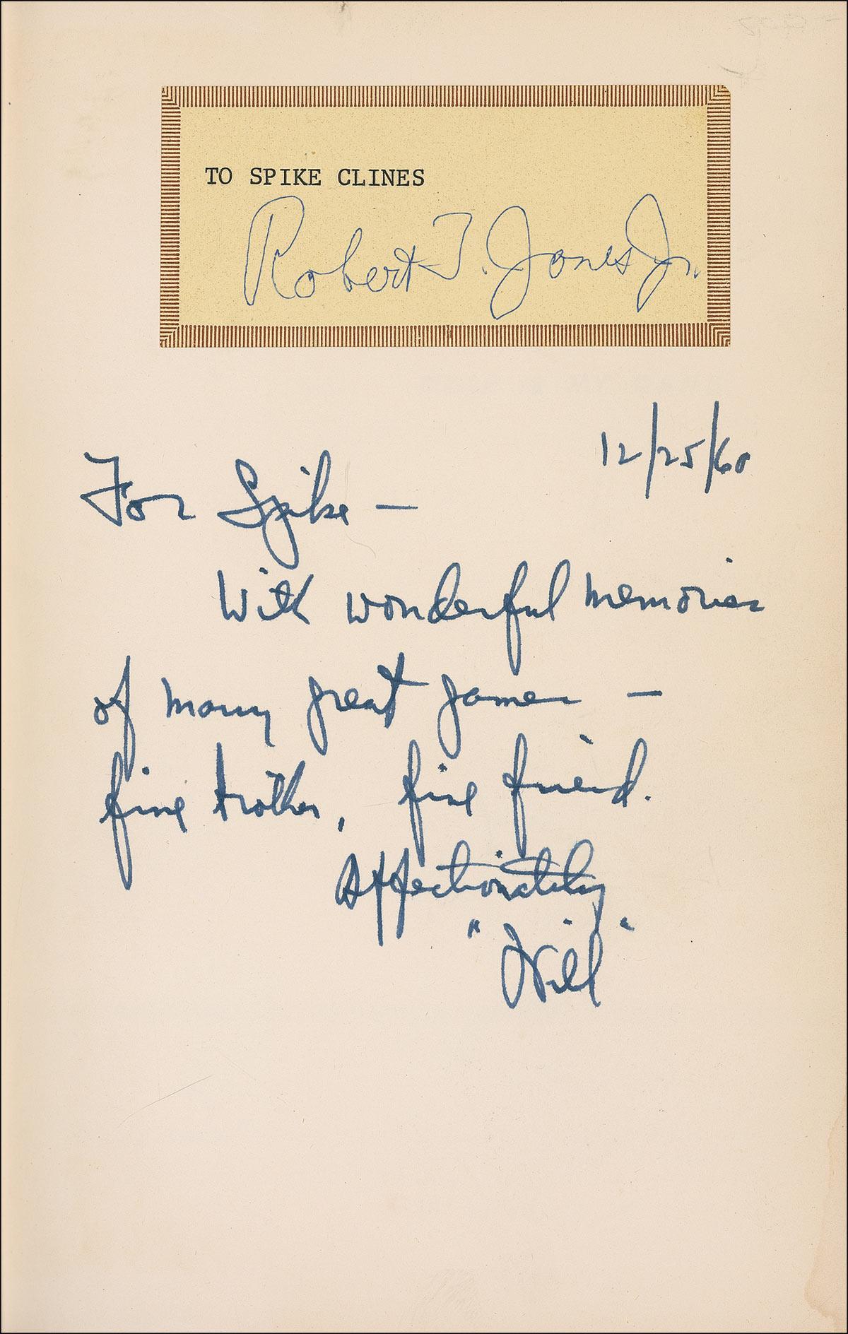 Signed book: Golf Is My Game. First edition, first printing. NY: Doubleday and Company, 1960. Hardcover with dustjacket, 6.25 x 9.5, 255 pages. Signed (post-stroke) on a bookplate affixed to the first free end page, “Robert T. Jones, Jr” (inscribed “To Spike Clines” in type above the signature). In very good condition, with gift inscription under bookplate, owner’s bookplate affixed to inside front cover, and a small crease and paperclip impression to signed bookplate. Dustjacket is soiled and creased, with heavier tears and stains to back and paper loss to spine and edges. Spike Clines was a champion regional golfer originally from Louisville, KY, who won the Kentucky Amateur Championship in 1932, 1934 and 1939. Pre-certified Steve Grad/PSA/DNA and RRAuction COA.