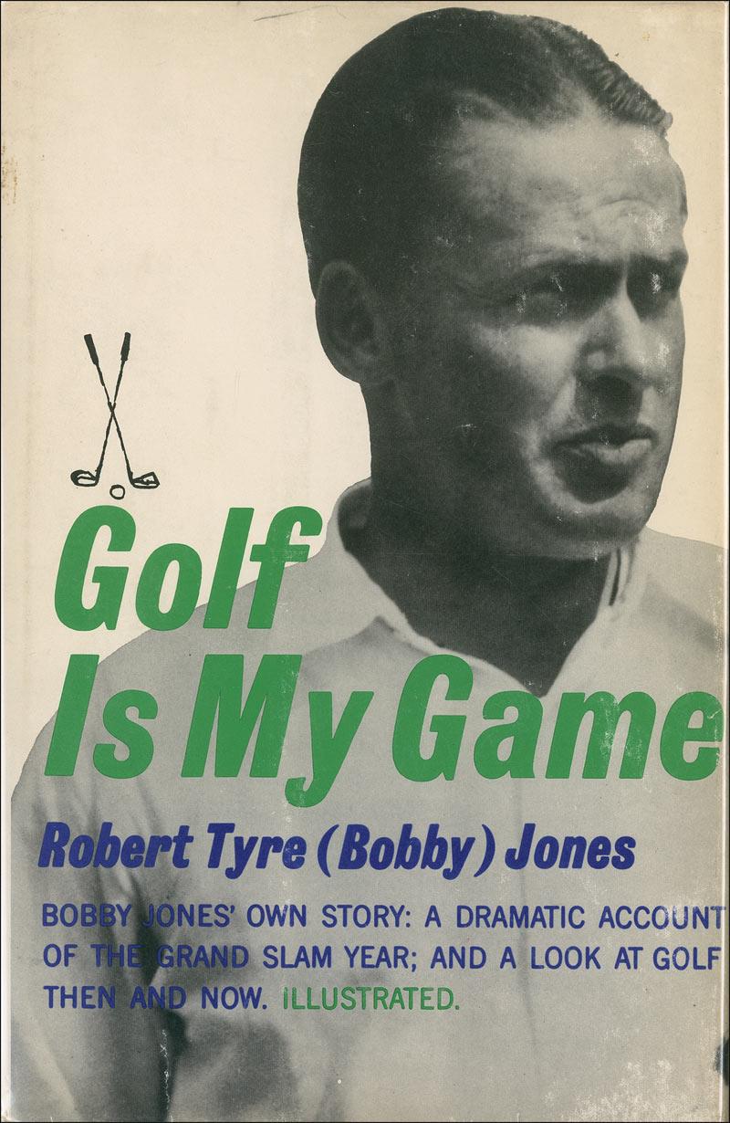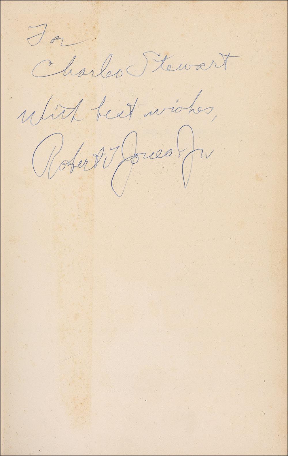 Signed book: Golf Is My Game. Later printing. NY: Doubleday and Company, 1960. Hardcover with dustjacket, 6.25 x 9.5, 255 pages. Signed and inscribed in ballpoint on the first free end page “For Charles Stewart, With best wishes, Robert T. Jones, Jr.” Light toning and soiling to price-clipped jacket, mild wear to extremities, and faint toning and spotting to left edge of signed page (touching a few words, including “Robert”), otherwise fine condition. Jones’s best-selling volume contains insights gleaned from 14 years of championship competition, more than 50 photographs and sketches illustrating his basic principles of the game, and a hole-by-hole account of the famous Augusta National Course. Pre-certified Steve Grad/PSA/DNA and RRAuction COA.