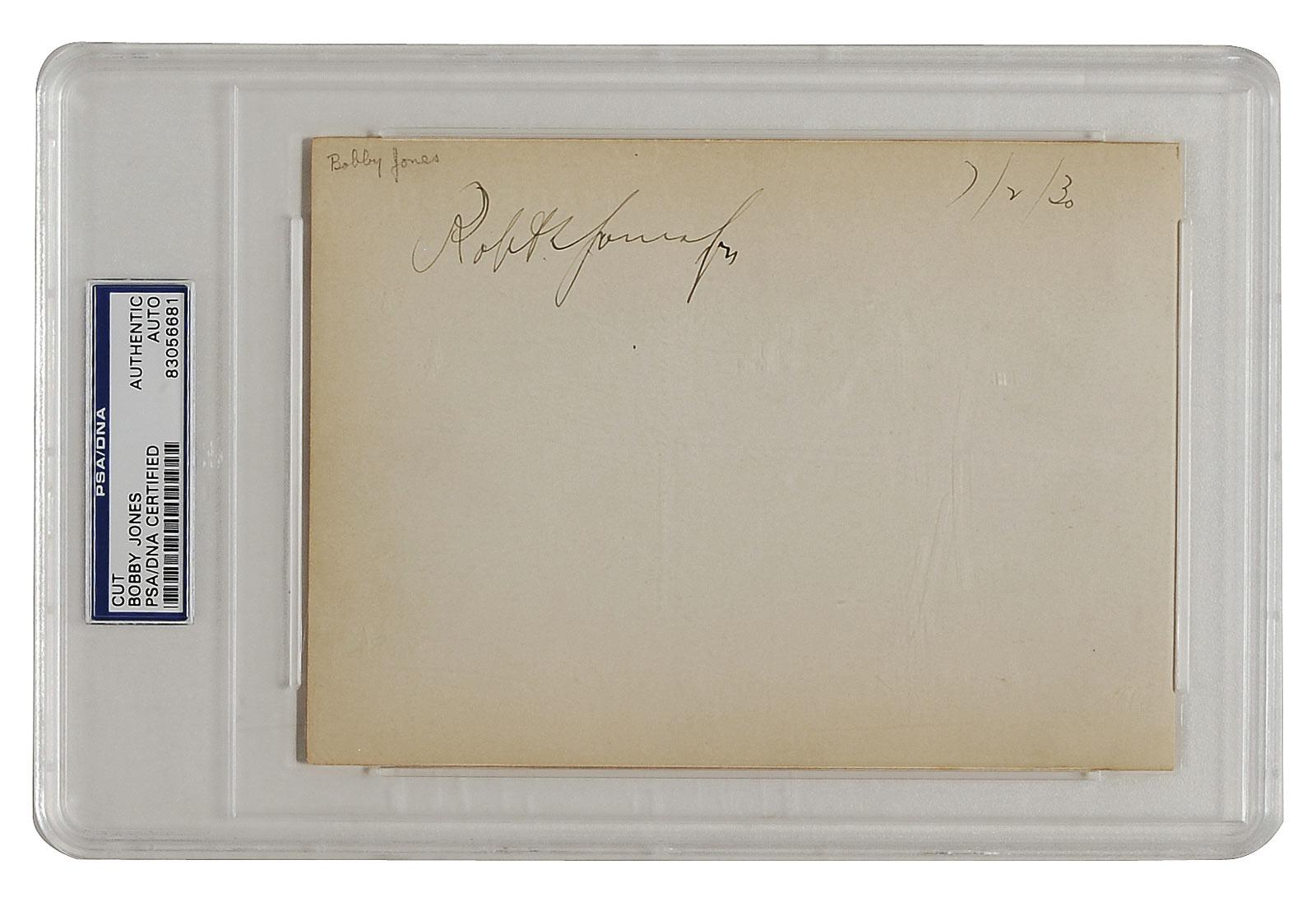 Vintage fountain pen signature, “Robt. T. Jones Jr.,” on an off-white 7 x 5 sheet, dated July 2, 1930. Encapsulated in a plastic PSA/DNA authentication holder. Mild toning, pencil notation at corner, and Jones went over the initial “R” twice, otherwise fine condition. RRAuction COA.
