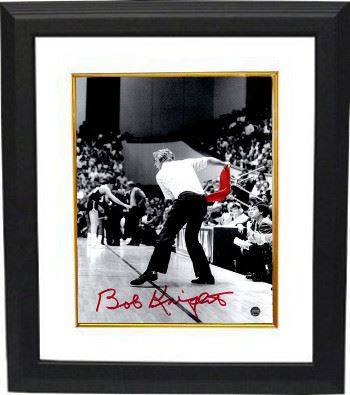 Bob Knight also known as "The General" won 902 career NCAA Games while coaching at West Point (1965-71), University of Indiana (1971-2000), and Texas Tech (2001-08). His 902 career wins are second most all-time only behind Coach K's career total at Duke. While coaching at Indiana Knight led his team to three National Titles, eleven Big Ten Conference Championships, he also won NCAA Coach of the Year four times. His career record was 902-371, and he was one of the most innovative coaches as he perfected the motion offense. Commemorate "The General" with this hand signed Indiana Hoosiers 11X14 Black & White Photo Throwing a Red Chair signed in Red. Steiner Sports Hologram and Certificate of Authenticity. Custom White Mat and Premium Black Frame as shown.