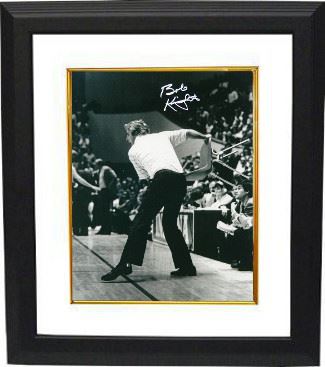 Bob Knight also known as "The General" won 902 career NCAA Games while coaching at West Point (1965-71), University of Indiana (1971-2000), and Texas Tech (2001-08). His 902 career wins are second most all-time only behind Coach K's career total at Duke. While coaching at Indiana Knight led his team to three National Titles, eleven Big Ten Conference Championships, he also won NCAA Coach of the Year four times. His career record was 902-371, and he was one of the most innovative coaches as he perfected the motion offense. Commemorate "The General" with this hand signed Indiana Hoosiers 16x20 B&W Photo Throwing a Chair. Schwartz Sports Hologram and Certificate of Authenticity from Athlon Sports. Custom White Mat and Premium Black Frame as shown.