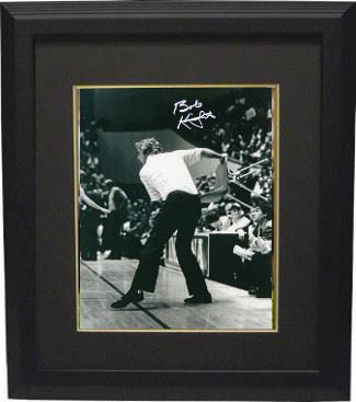 Bob Knight also known as "The General" won 902 career NCAA Games while coaching at West Point (1965-71), University of Indiana (1971-2000), and Texas Tech (2001-08). His 902 career wins are second most all-time only behind Coach K's career total at Duke. While coaching at Indiana Knight led his team to three National Titles, eleven Big Ten Conference Championships, he also won NCAA Coach of the Year four times. His career record was 902-371, and he was one of the most innovative coaches as he perfected the motion offense. Commemorate "The General" with this hand signed Indiana Hoosiers 16x20 B&W Photo Throwing a Chair. Schwartz Sports Hologram and Certificate of Authenticity from Athlon Sports. Custom Black Mat and Premium Black Frame as shown.