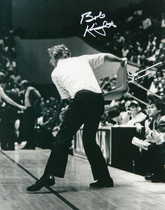 Bob Knight also known as "The General" won 902 career NCAA Games while coaching at West Point (1965-71), University of Indiana (1971-2000), and Texas Tech (2001-08). His 902 career wins are second most all-time only behind Coach K's career total at Duke. While coaching at Indiana Knight led his team to three National Titles, eleven Big Ten Conference Championships, he also won NCAA Coach of the Year four times. His career record was 902-371, and he was one of the most innovative coaches as he perfected the motion offense. Commemorate "The General" with this hand signed Indiana Hoosiers 16x20 B&W Photo Throwing a Chair. Schwartz Sports Hologram and Certificate of Authenticity from Athlon Sports.