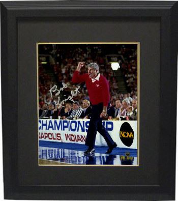 Bob Knight also known as "The General" won 902 career NCAA Games while coaching at West Point (1965-71), University of Indiana (1971-2000), and Texas Tech (2001-08). His 902 career wins are second most all-time only behind Coach K's career total at Duke. While coaching at Indiana Knight led his team to three National Titles, eleven Big Ten Conference Championships, he also won NCAA Coach of the Year four times. His career record was 902-371, and he was one of the most innovative coaches as he perfected the motion offense. Commemorate "The General" with this hand signed Indiana Hoosiers 8x10 Color Photo Red Sweater Yell signed in silver. Steiner Sports Hologram and Certificate of Authenticity. Custom Black Mat and Premium Black Color Framed as shown.