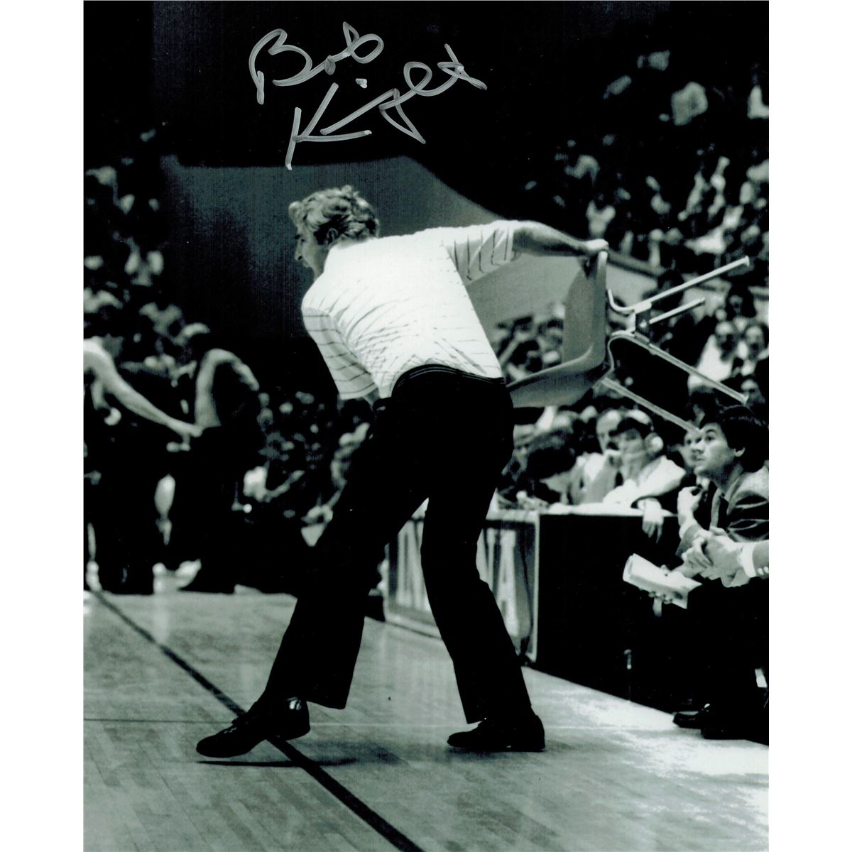 Bobby Knight signed Indiana Hoosiers black and white throwing chair 8x10 photo. Item comes with a Schwartz Sports Memorabilia tamper-proof numbered hologram and Certificate of Authenticity which can be verified online.
